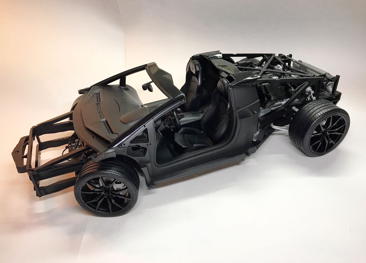 Сборная модель состоит из 814 деталей, изготовленных из различных материалов, включая металл, резину, текстиль и пластика премиум качества. Рулевое управление, подвеска и механизм спойлера функционируют наряду с открывающимися дверями, капотом и багажником. В собранном виде модель впечатляет своим размером - 595мм х 287мм х 144мм.